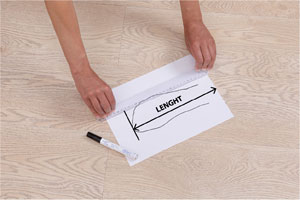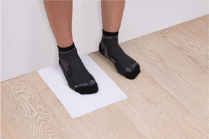 Place and fix an A4 sheet of paper on the floor against a straight wall that ends flush with the floor. Wear your usual skating socks for more accuracy and place your foot on the sheet with your heel touching the wall (make sure your heel touches the wall without significant pressure.)