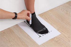 Stand relaxed on the foot you are measuring and draw a line around the outline of your foot starting at the big toe. Be sure to hold the pencil vertically to prevent any deviation. It's ideal to have a friend draw the line for better accuracy. Measure the length of the paper to the line: that's your MONDOPOINT size.